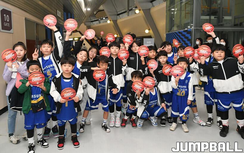 19일 잠실체육관에서 열린 2022-2023 SKT 에이닷 프로농구 서울 삼성과 서울 SK의 이번 시즌 마지막 S더비 경기, 삼성 리틀 썬더스 선수들이 기념 촬영을 하고 있다.