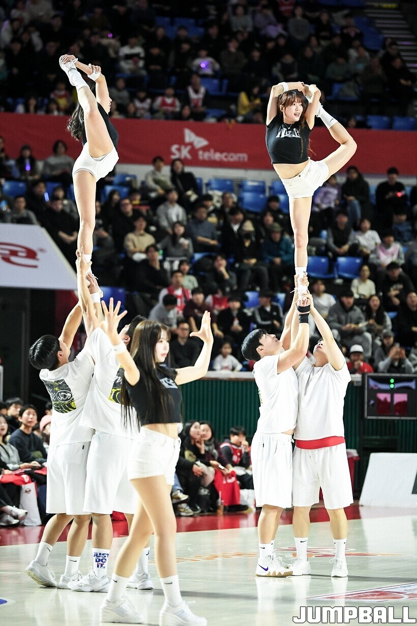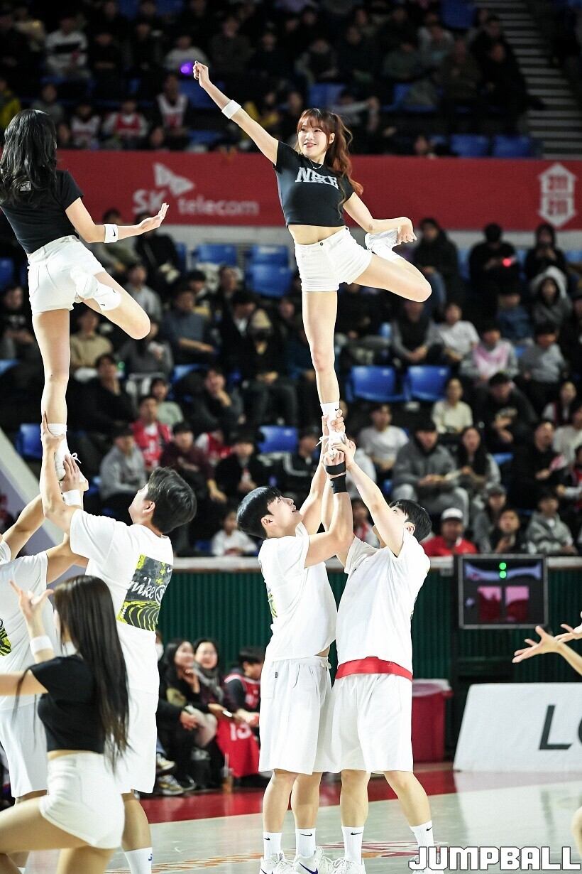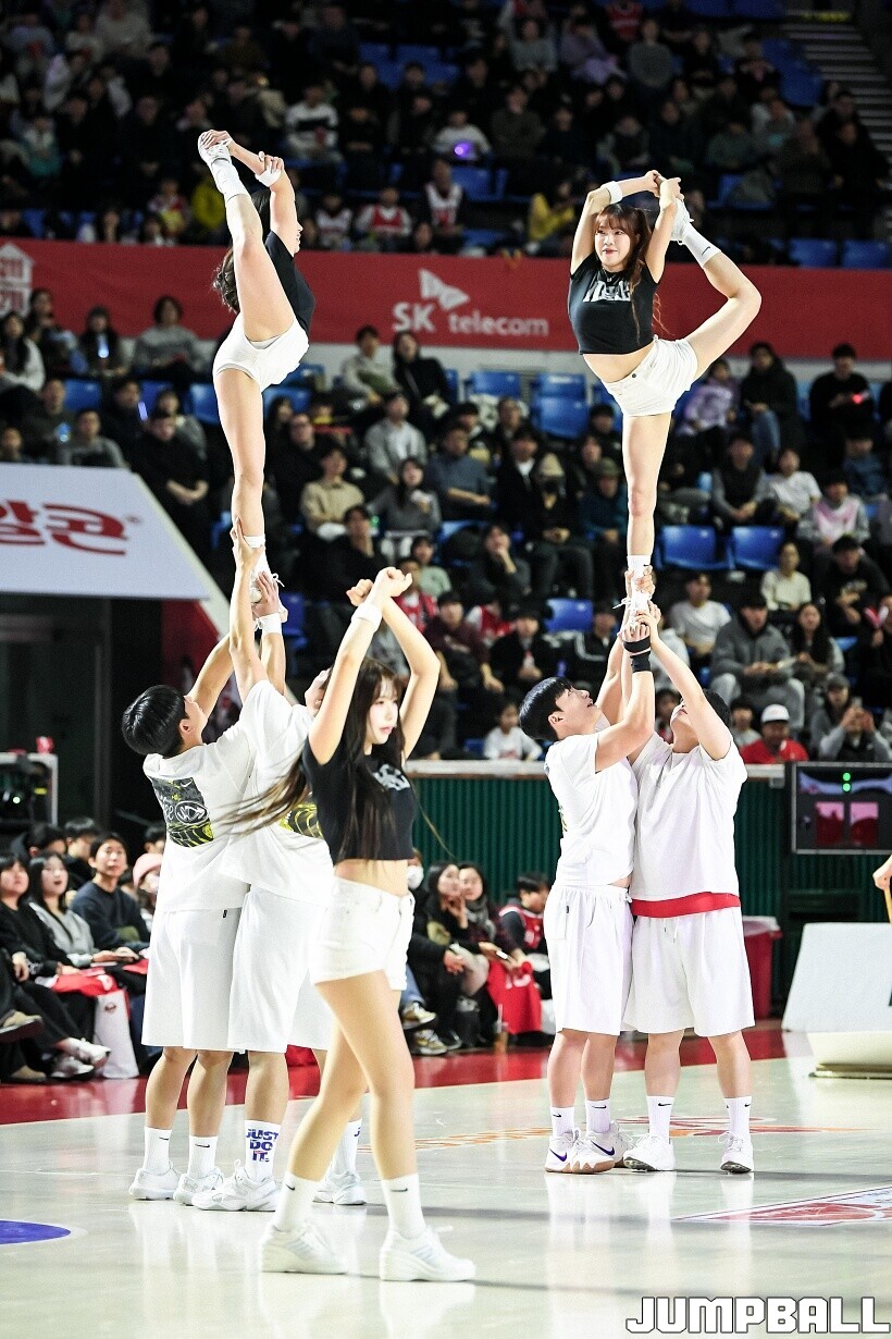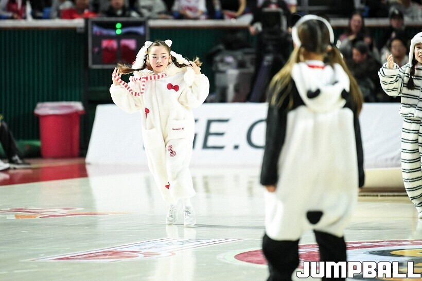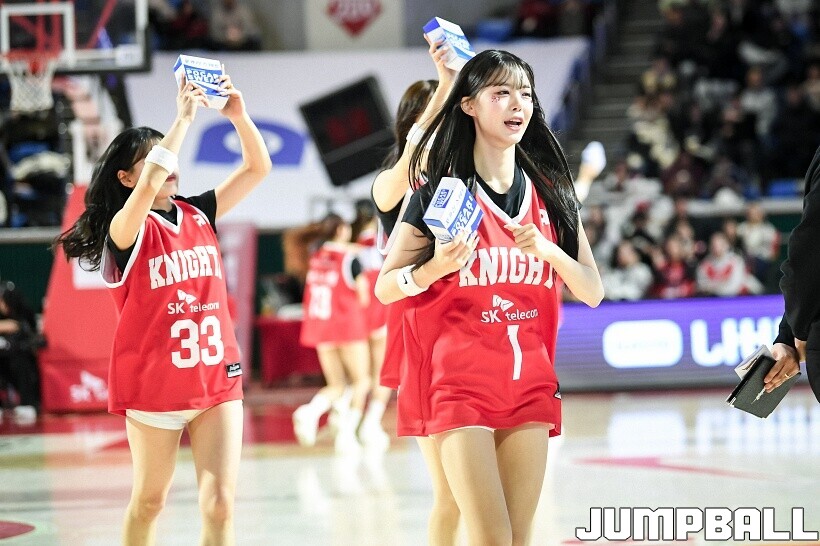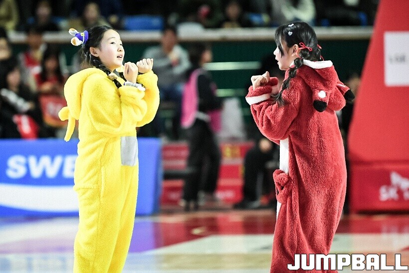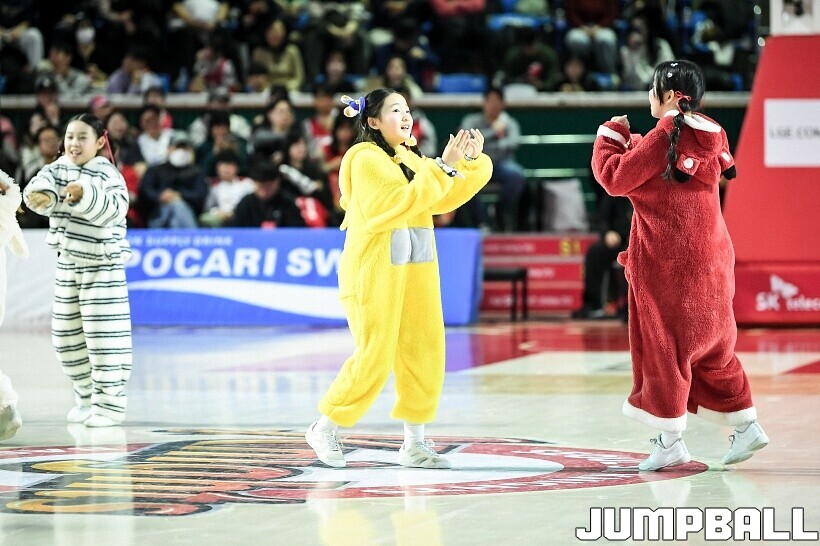 [점프볼=잠실/유용우 기자] 10일 잠실학생체육관에서 열린 2025-2026 LG전자 프로농구 서울 SK와 서울 삼성의 경기, SK 치어리더들이 화려한 퍼포먼스를 펼치며 팀 승리를 기원하고 있다. 어린이 응원단은 귀여운 율동을 펼치며 홈팬들의 박수와 환호를 이끌었다.