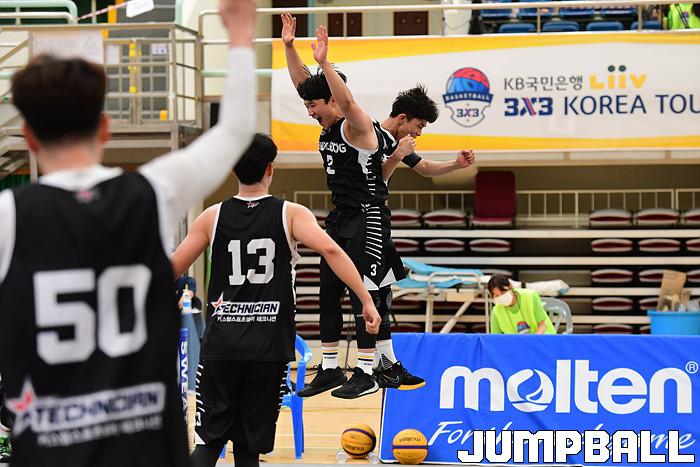 [점프볼=양산/박상혁 기자] 26일 양산실내체육관에서 열린 'KB국민은행 LiiV 3X3 코리아투어 2020 양산대회' 2일차 경기, 남자오픈부 언더독이 승리한후 환호하고 있다.