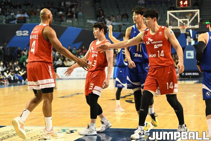 19일 잠실체육관에서 열린 2022-2023 SKT 에이닷 프로농구 서울 삼성과 서울 SK의 이번 시즌 마지막 S더비 경기, SK 선수들이 하이파이브를 하고 있다.