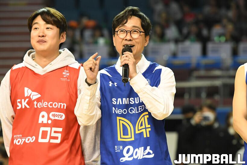 19일 잠실체육관에서 열린 2022-2023 SKT 에이닷 프로농구 서울 삼성과 서울 SK의 이번 시즌 마지막 S더비 경기, 영화 리바운드에 장항준 감독이 관중들에게 인사를 하고 있다.