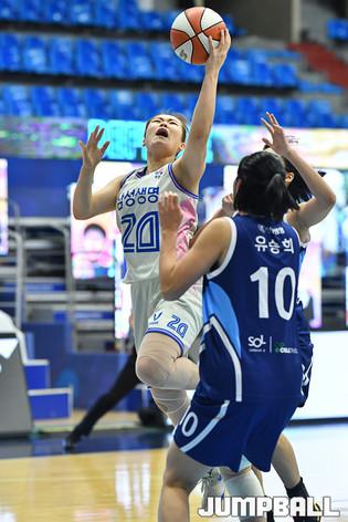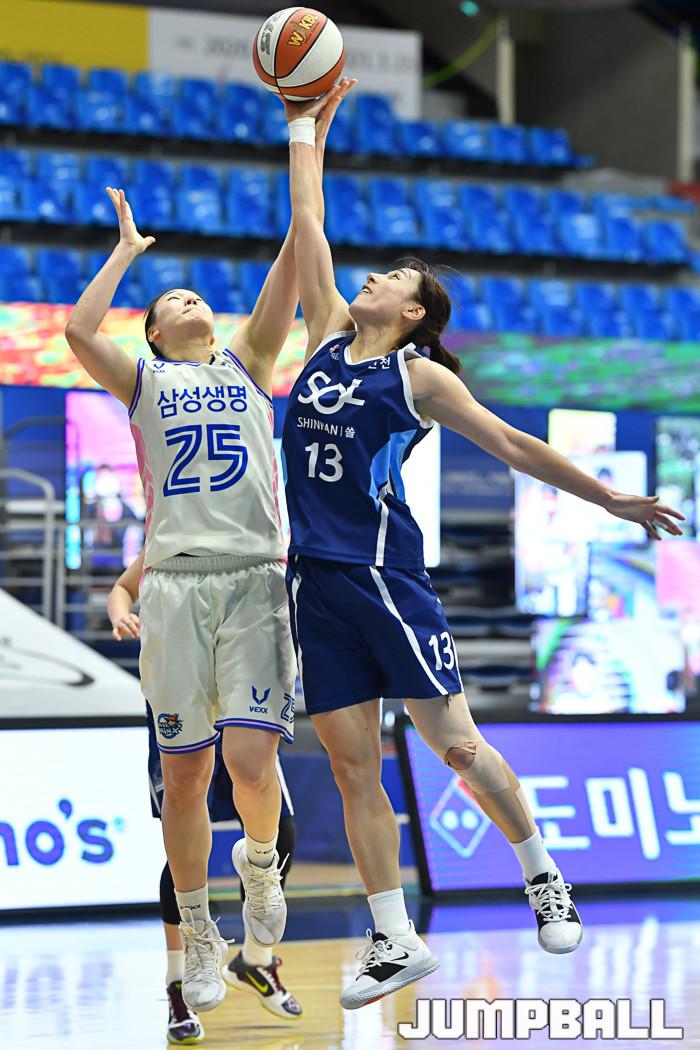 [점프볼=인천/유용우 기자] 17일 인천 도원체육관에서 열린 'KB국민은행 Liiv M 2020~2021 여자프로농구' 신한은행과 삼성생명의 경기, 신한은행 김단비와 삼성생명 배혜윤이 리바운드를 경합하고 있다.