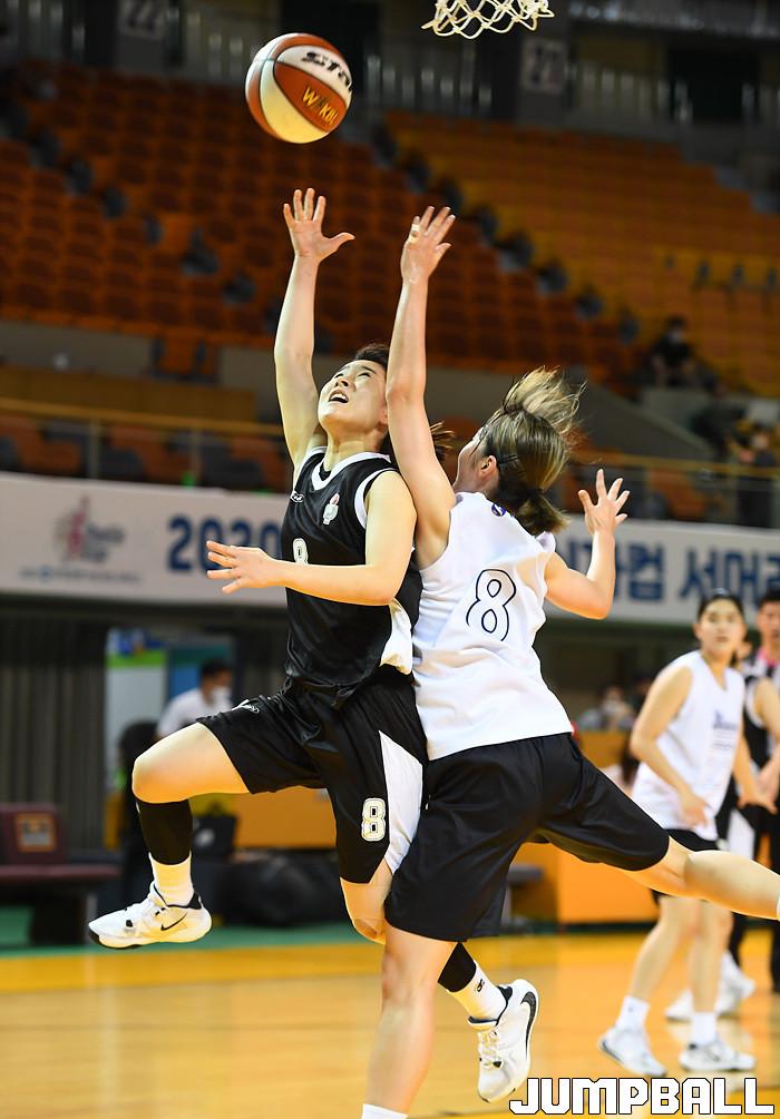 [점프볼=청주/문복주 기자] 17일 청주체육관에서 열린 '2020 우리은행 박신자컵 서머리그' 대학선발과 신한은행의 경기, 대학선발 이지우가 골밑을 날렵하게 돌파해서 슛을 시도하고 있다.