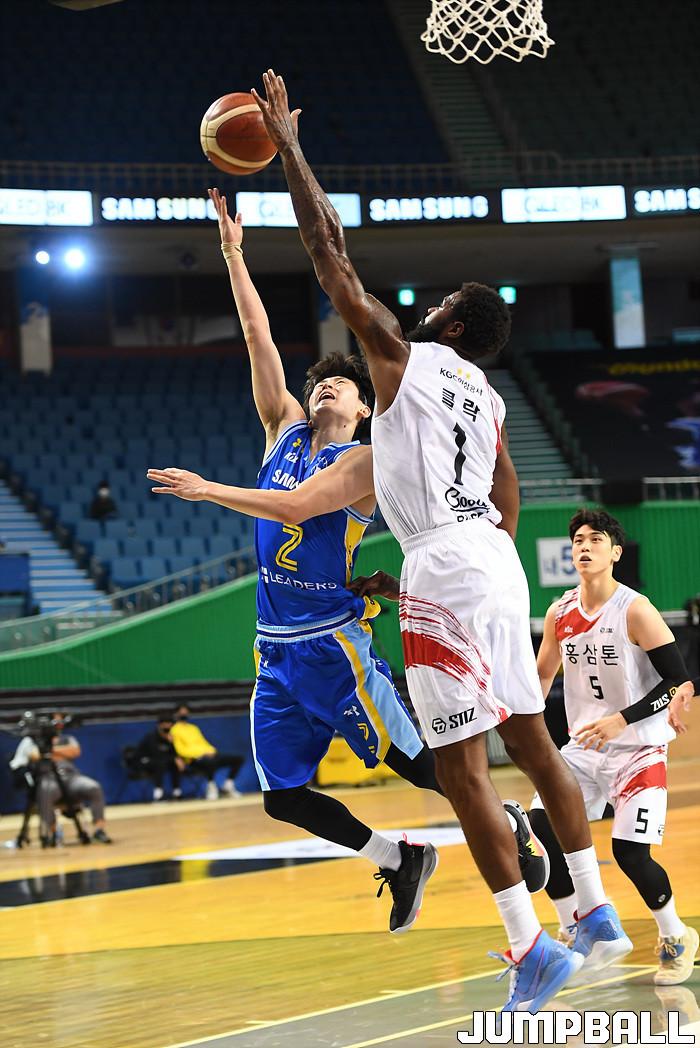 [점프볼=서울/문복주 기자] 10일 잠실실내체육관에서 열린 2020-2021 현대모비스 프로농구 서울 삼성과 안양 KGC인삼공사의 경기, 삼성 이호현의 골밑슛을 KGC 클락이 블로킹하고 있다.