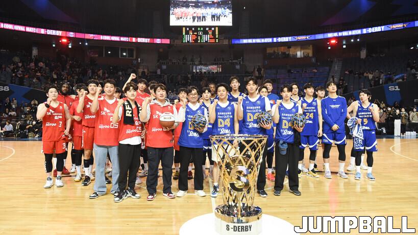 19일 잠실체육관에서 열린 2022-2023 SKT 에이닷 프로농구 서울 삼성과 서울 SK의 이번 시즌 마지막 S더비 경기, SK가 삼성에 78-72로 승리했다. 경기 종료 후 영화 리바운드팀이 삼성, SK 선수들과 단체 사진 촬영을 하고 있다.
