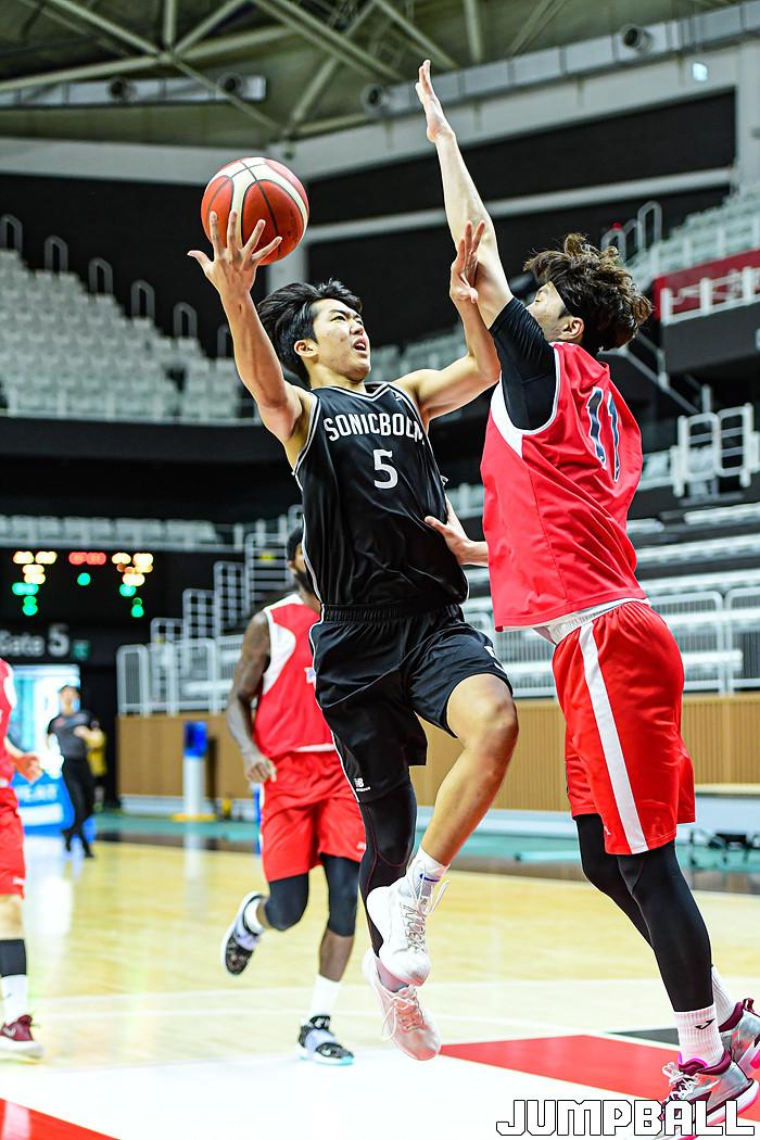2일 경기도 수원에 위치한 수원 KT 소닉붐 아레나에서 수원 KT와 울산 현대모비스의 연습경기가 열렸다. KT 박지원이 골밑에서 슛을 시도하고 있다.