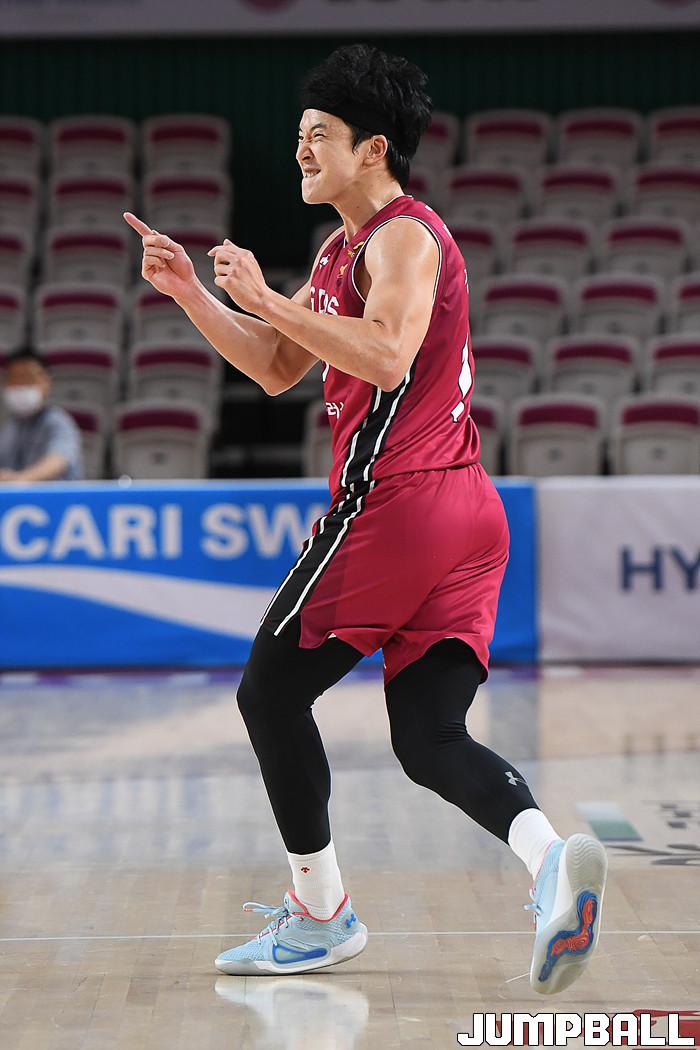 [점프볼=창원/박상혁 기자] 11일 창원실내체육관에서 열린 2020-2021 현대모비스 프로농구 창원 LG와 부산 KT의 경기, LG 강병현이 3점슛을 성공시킨후 환호하고 있다.