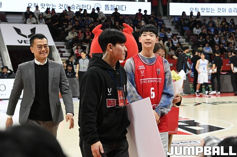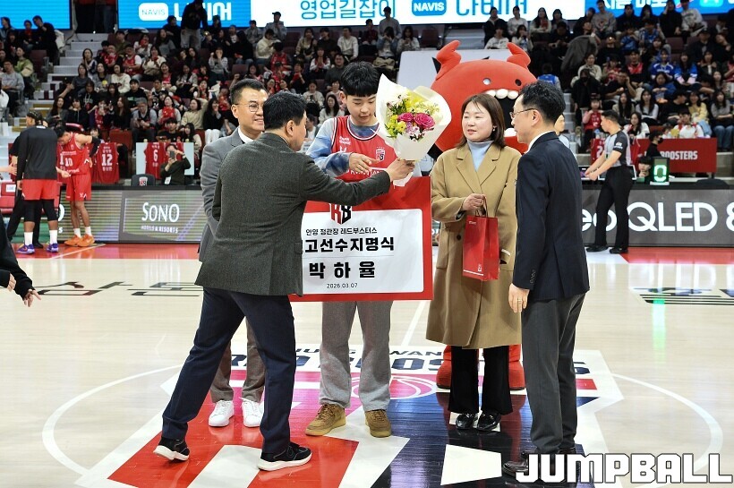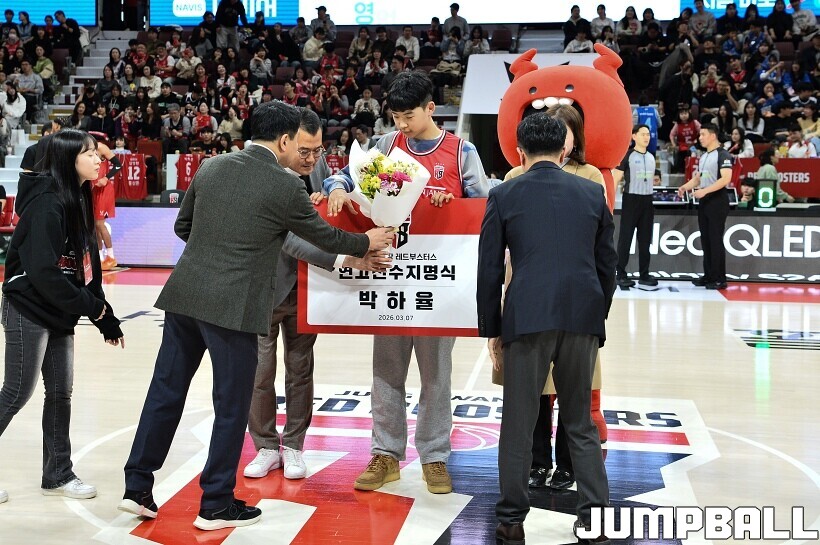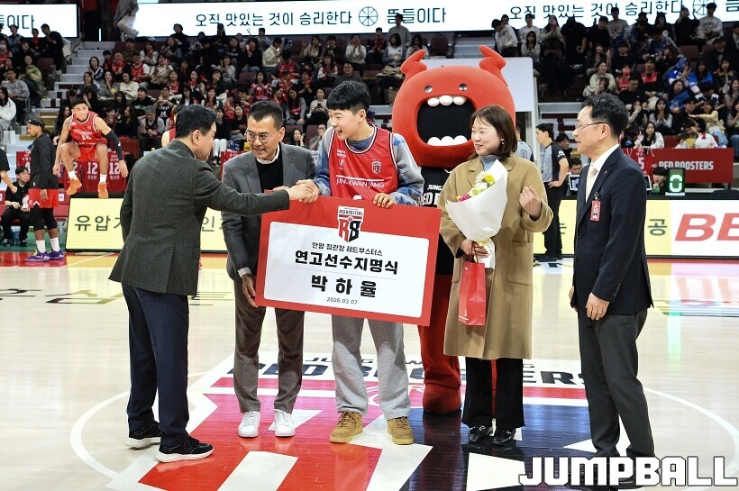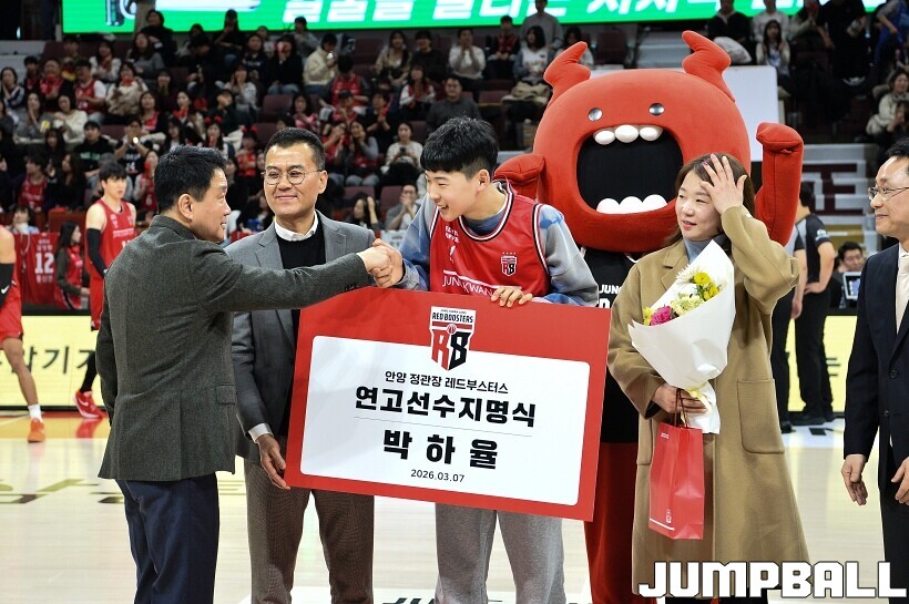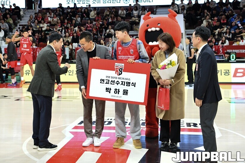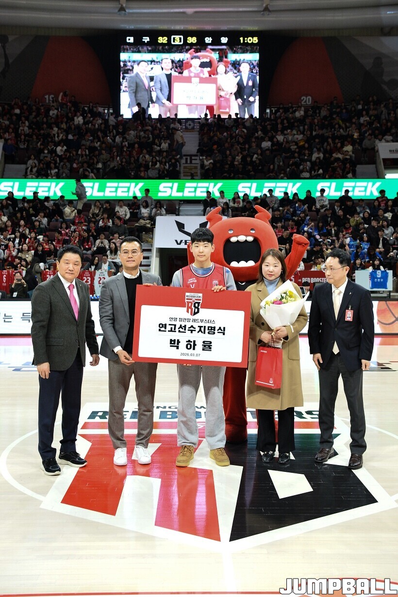 [점프볼=안양/유용우 기자] 7일 안양 정관장 아레나에서 열린 2025-2026 LG전자 프로농구 안양 정관장과 대구 한국가스공사의 경기, 하프타임에 안양호계중 박하율(15)의 연고선수 지명식이 진행됐다. 박하율은 정관장 농구단 산하 TOP 유소년 클럽 소속으로 활약하고 있다. 정관장은 창단 후 처음으로 연고선수를 지명했다.