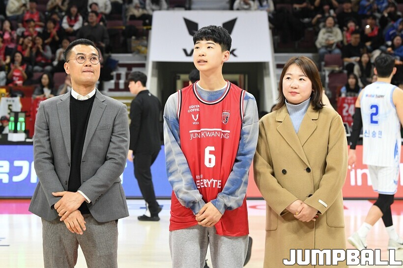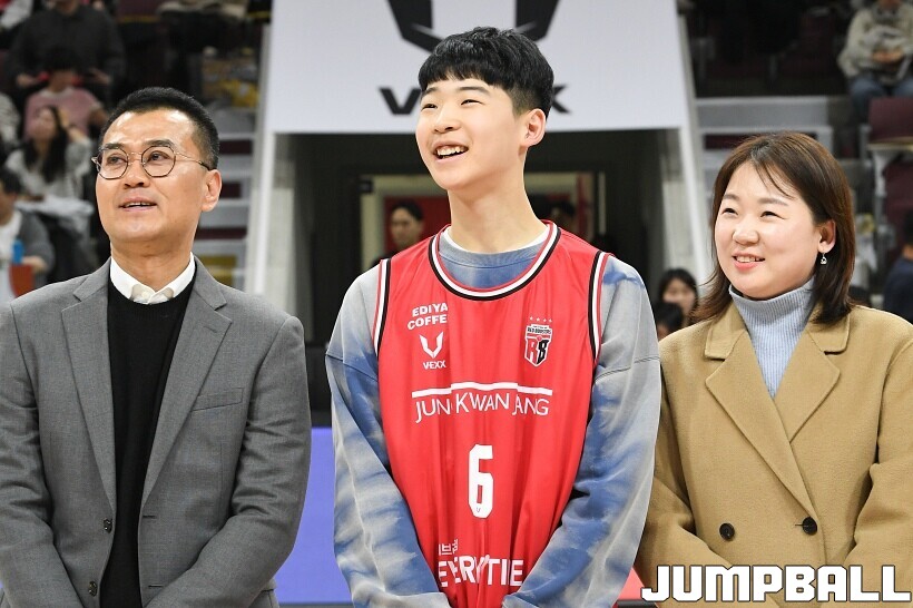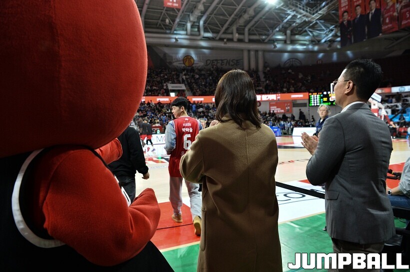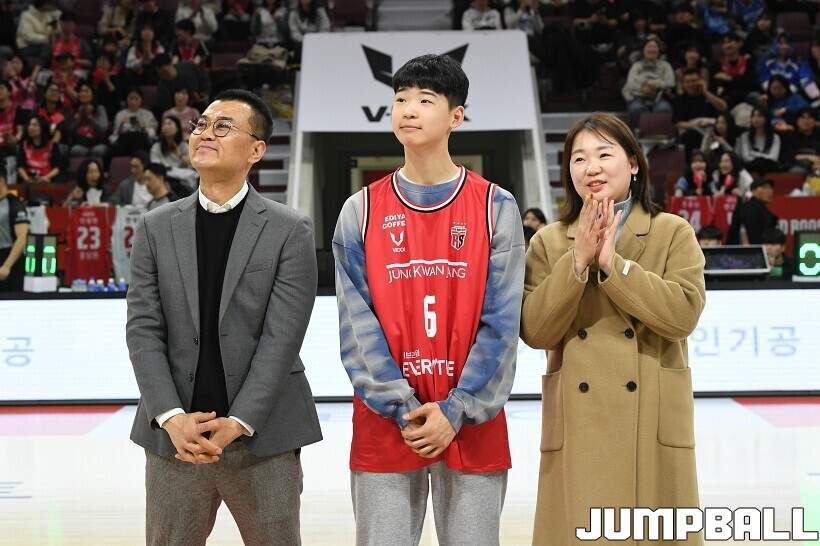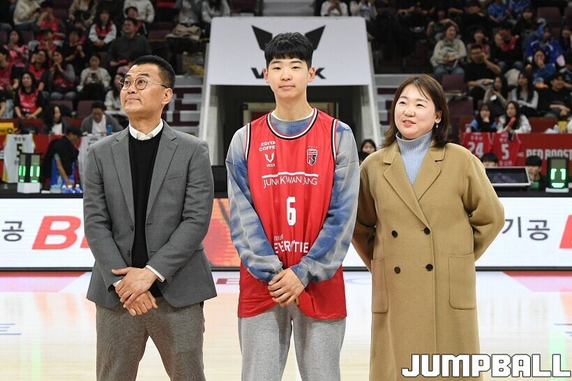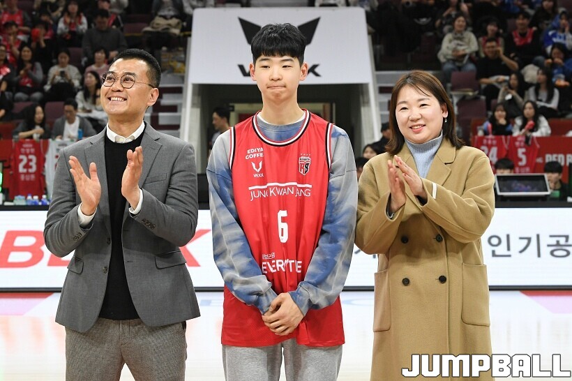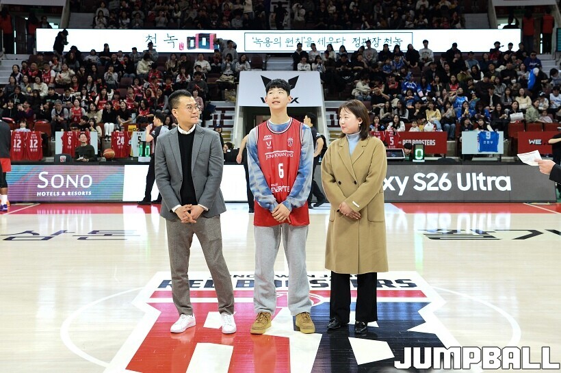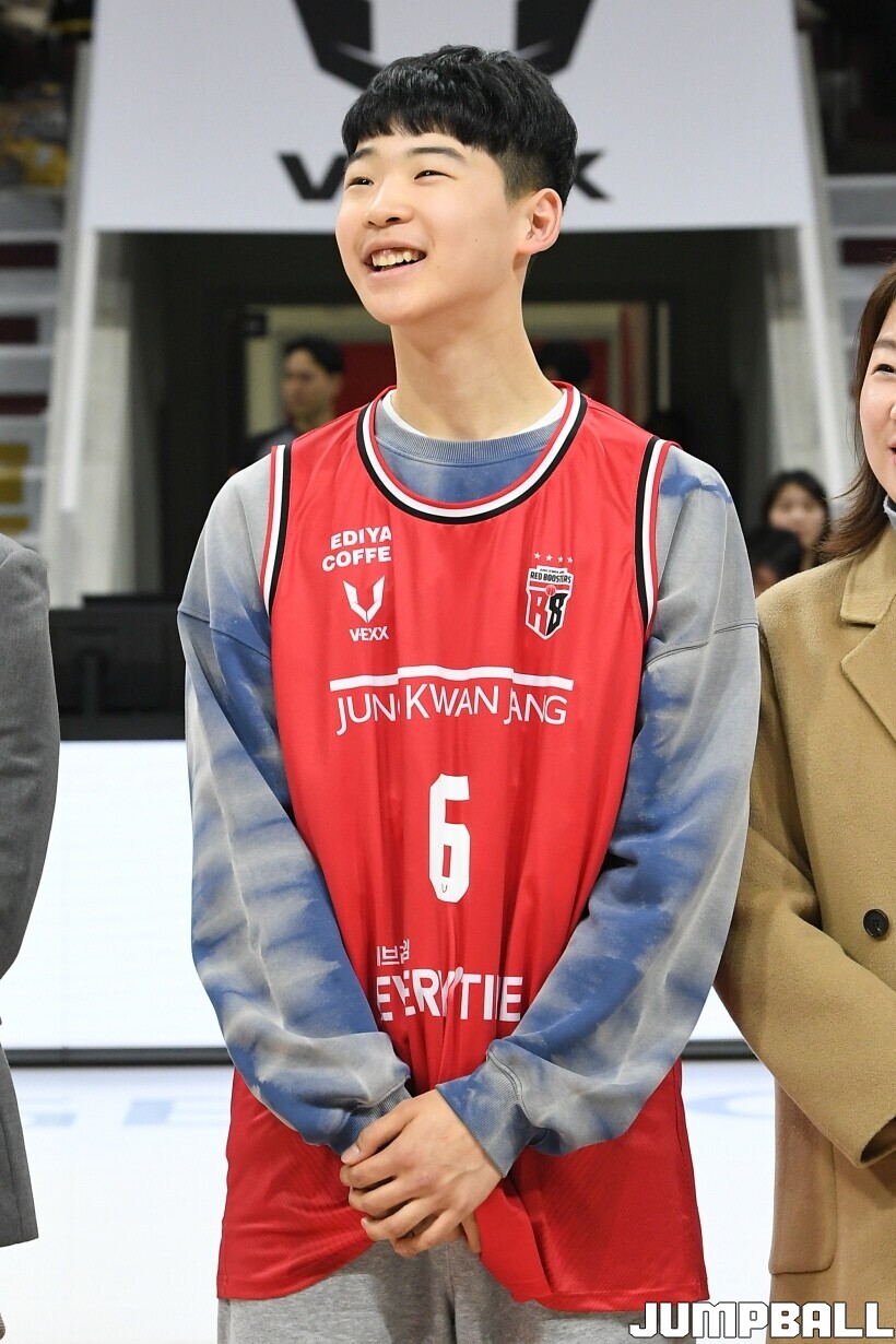 [점프볼=안양/유용우 기자] 7일 안양 정관장 아레나에서 열린 2025-2026 LG전자 프로농구 안양 정관장과 대구 한국가스공사의 경기, 하프타임에 안양호계중 박하율(15)의 연고선수 지명식이 진행됐다. 박하율은 정관장 농구단 산하 TOP 유소년 클럽 소속으로 활약하고 있다. 정관장은 창단 후 처음으로 연고선수를 지명했다.