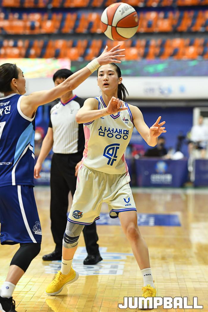 [점프볼=인천/유용우 기자] 17일 인천 도원체육관에서 열린 'KB국민은행 Liiv M 2020~2021 여자프로농구' 신한은행과 삼성생명의 경기, 삼성생명 윤예빈이 패스를 하고 있다.