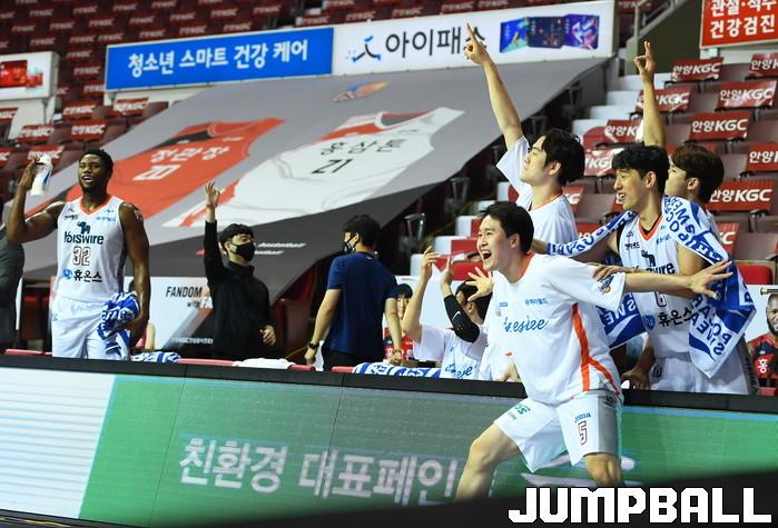 [점프볼=안양/문복주 기자] 9일 안양체육관에서 열린 2020-2021 현대모비스 프로농구 안양 KGC인삼공사와 인천 전자랜드의 경기, 전자랜드 정영삼이 3점슛을 성공시키자 벤치 선수들이 환호하고 있다.