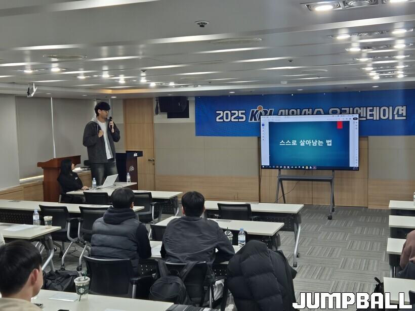 15일 서울시 논현동 KBL 센터 5층 교육장에서 열린 2025 KBL 신인선수 오리엔테이션. 뜻밖의 남자가 KBL을 찾았다. 바로 하승진이었다. 2019년 현역 은퇴를 선언한 그는 현재 방송인과 유튜버로 활발하게 활동 중이다. 이날은 일일 강사로 변신, 선수단 소양 교육을 위해 후배들 앞에 섰다.