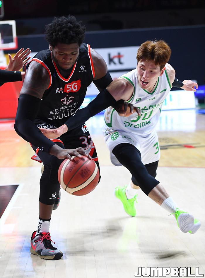 [점프볼=부산/문복주 기자] 13일 부산 사직실내체육관에서 열린 2020-2021 현대모비스 프로농구 부산 kt와 원주 DB의 경기, kt 데릭슨의 볼을 DB 두경민이 스틸을 시도하고 있다.