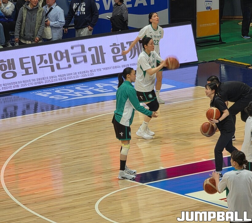 이후 정규리그의 끝을 직감한 듯, 전반 종료 후 하프타임. 김정은은 골밑에서 후배들의 슛 연습을 묵묵히 받아줬다.