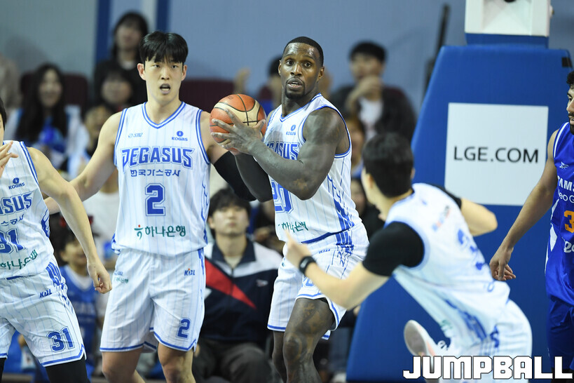 전반 흐름은 팽팽했다. 양 팀 모두 외곽은 좀처럼 살아나지 않았다. 삼성은 3점슛 3개, 성공률 23%에 머물렀고 가스공사도 2개, 20%로 답답했다. 대신 골밑에서 활로를 찾았다. 외국인 선수들의 인사이드 득점이 이어지며 팽팽한 승부가 펼쳐졌다.