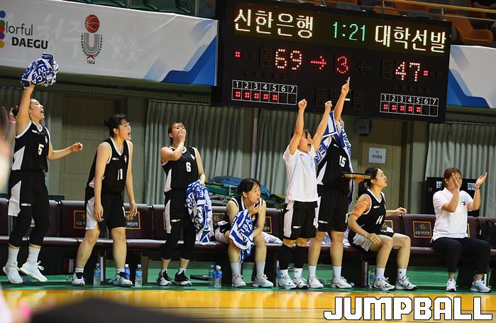 [점프볼=청주/문복주 기자]  17일 청주체육관에서 열린 '2020 우리은행 박신자컵 서머리그' 대학선발과 신한은행의 경기, 대학선발 김효진의 3점슛이 성공하자 벤치 선수들이 환호하고 있다.