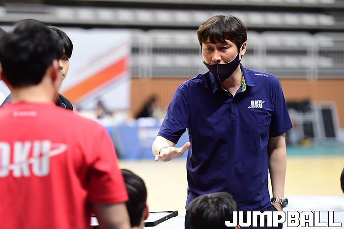 [점프볼=수원/박상혁 기자] 25일 서수원칠보체육관에서 열린 2021 KUSF 대학농구 U-리그 한양대와 단국대 경기, 단국대 석승호 감독이 선수들에게 지시를 내리고 있다.