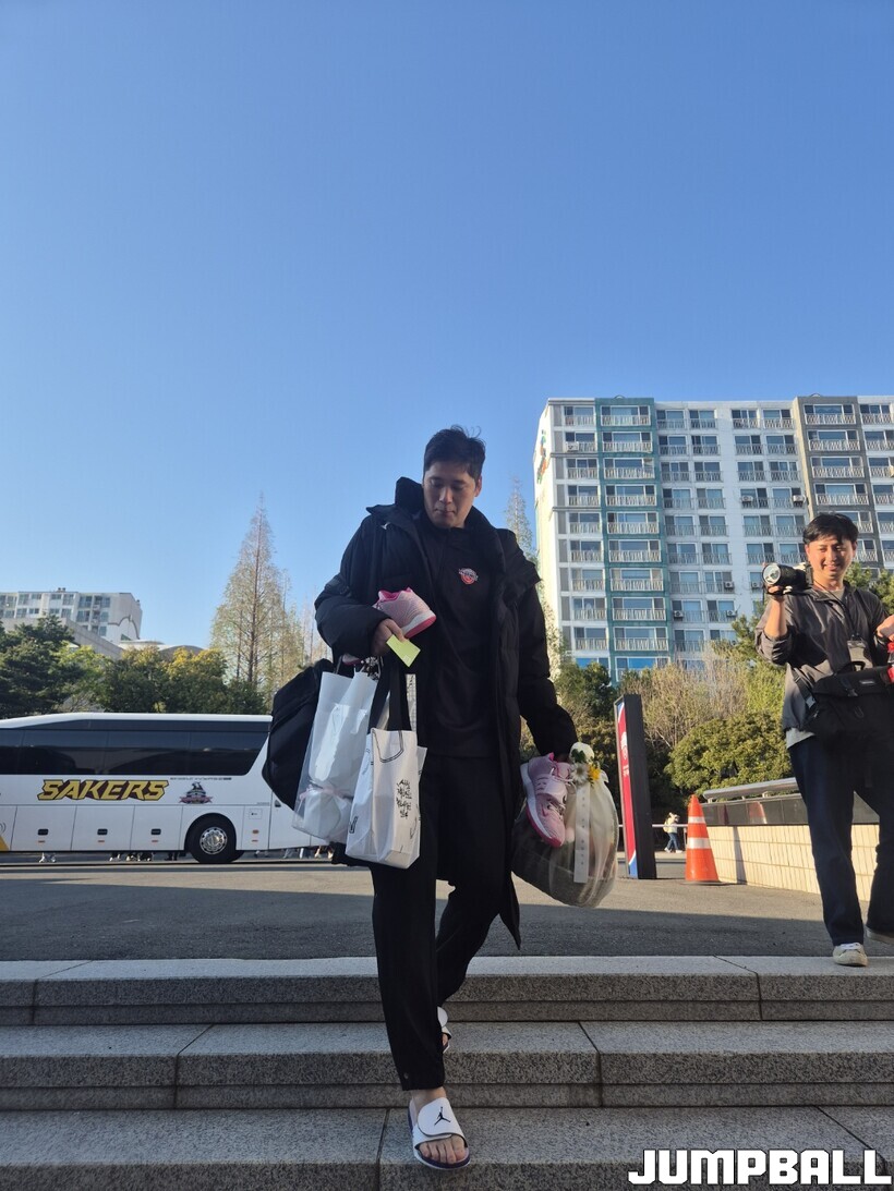 5시 20분이 좀 지난 시각. 현대모비스 선수단 버스가 도착했다. 함지훈의 마지막 출근길을 담고자 선수단 출입구에 기다렸다. 잠시 후 함지훈이 등장했다. 상징과도 같은 슬리퍼를 신고...많은 팬들과 미디어가 자리해 레전드의 마지막 출근길을 반겼다.