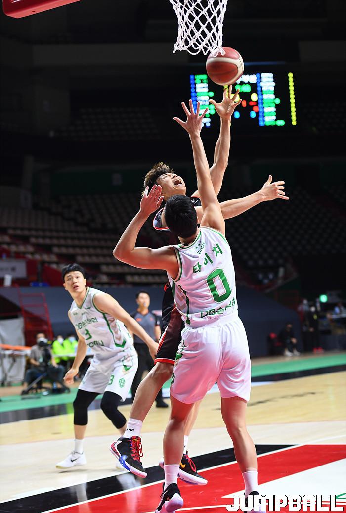 [점프볼=부산/문복주 기자] 13일 부산 사직실내체육관에서 열린 2020-2021 현대모비스 프로농구 부산 kt와 원주 DB의 경기, kt 김영환이 골밑에서 수비를 달고 슛을 시도하고 있다.