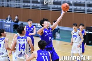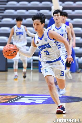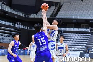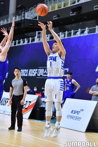 [점프볼=수원/홍기웅 기자] 6일 수원 서수원칠보체육관에서 열린 '2021 KUSF 대학농구 U-리그 3차대회' 명지대와 조선대의 경기. 명지대 한정도가 리바운드를 잡아내고 있다.
