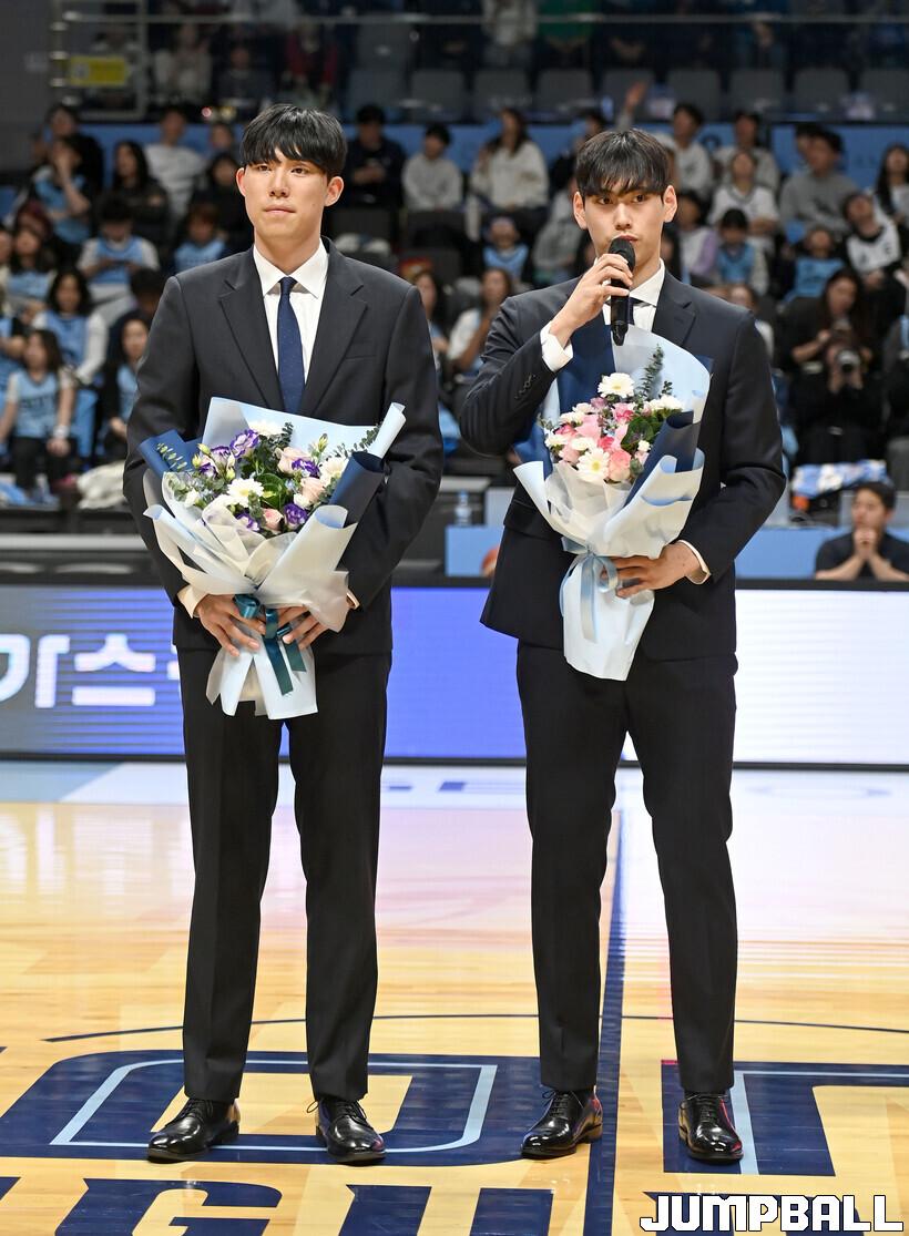 이날 소노는 하프타임에 신인 선수들을 위한 환영식을 개최했다. 이기완 소노 단장이 이들에게 꽃다발을 전달하며 격려했고, 신지원 역시 위너스(소노 팬 애칭)와 첫 인사를 나눴다. 프로 선수로서 새 출발을 알리는 자리이기에 긴장한 표정이 역력했다.