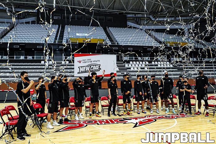 2일 경기도 수원에 위치한 수원 KT 소닉붐 아레나에서 KT가 온라인 출정식을 가졌다. KT 선수단이 KT의 이번 시즌 슬로건을 공개하며 환호하고 있다.