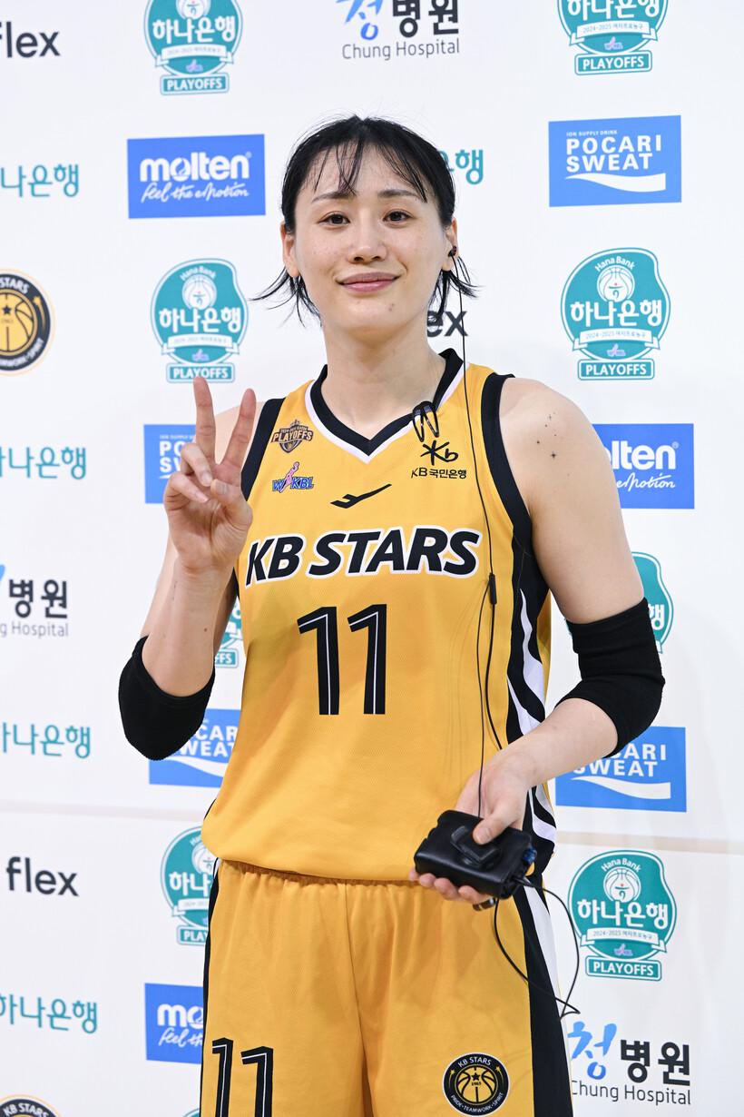 청주 KB스타즈의 강이슬은 8일 청주체육관에서 열린 하나은행 2024~2025 여자프로농구 4강 플레이오프 아산 우리은행과 4차전에서 17점 8리바운드 3어시스트로 맹활약하며 팀의 62-61 신승을 이끌었다