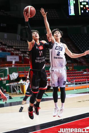 [점프볼=윤민호 기자] 8일 사직실내체육관에서 열린 2020-2021 현대모비스 프로농구 부산 KT와 전주 KCC의 경기에서 KCC 이정현이 KT 브라운의 수비를 피해 슛을 하고 있다.
