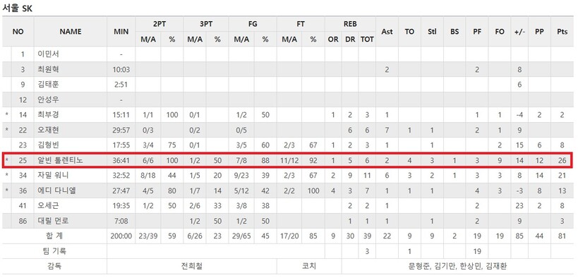톨렌티노는 안영준, 김낙현이 연달아 이탈한 SK의 구세주다. 최근 2경기 연속 개인 최다인 25점을 올리며 SK를 2연승으로 이끌었다. 공격 횟수 자체가 급격히 증가했다. 이전 36경기에서 평균 6.8개의 야투를 시도했던 톨렌티노는 최근 2경기 모두 16개의 야투를 던졌다.