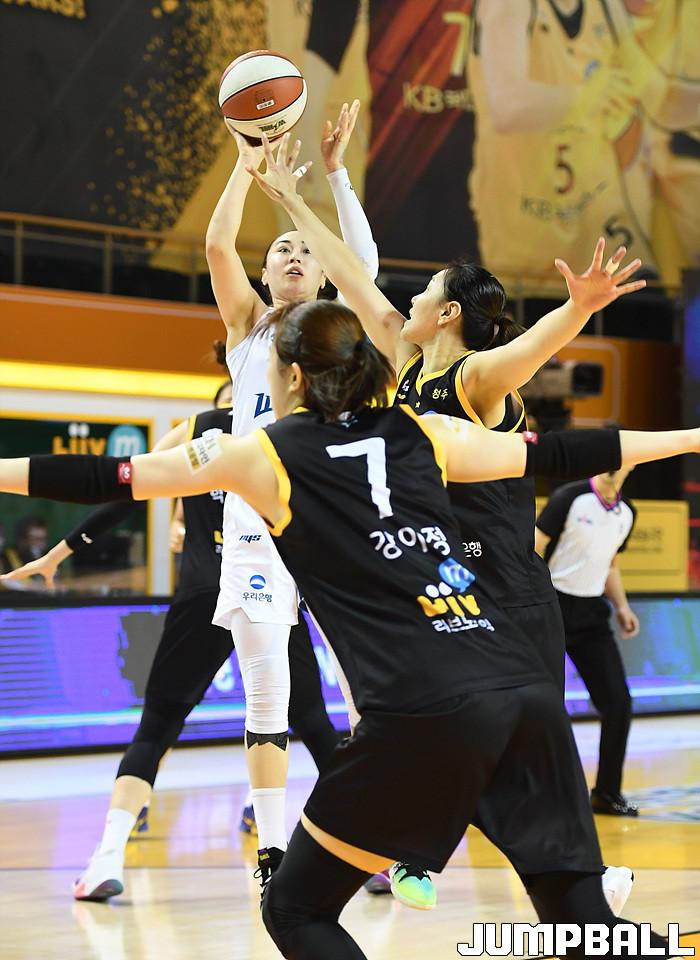 [점프볼=청주/문복주 기자] 21일 청주체육관에서 열린 KB국민은행 LiiV M 2020~2021 여자프로농구 청주 KB스타즈와 아산 우리은행의 경기, 우리은행 김소니아가 점프슛을 시도하고 있다.