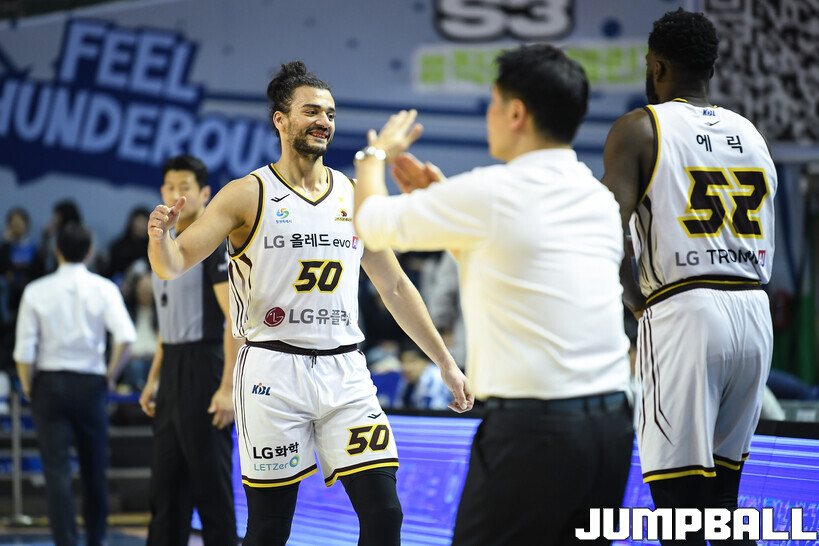 LG는 양준석의 풋백 득점으로 급한 숨을 골랐다. 44-36. 이어 수비가 안쪽으로 쏠린 틈을 읽은 에릭이 외곽의 정인덕을 찾았다. 패스는 정확했고, 3점슛은 림을 갈랐다. 3분 14초를 남기고 점수는 47-36이 됐다.