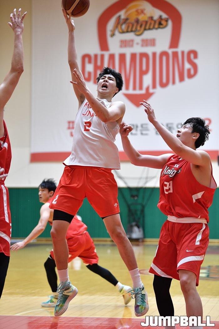 [점프볼=양지/유용우 기자] 6일 용인시 처인구에 위치한 SK 양지체육관에서 열린 서울 SK와 고려대의 연습경기, SK 고려대 신민석이 레이업을 올리고 있다.