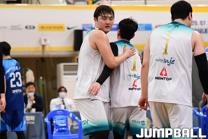 [점프볼=양산/박상혁 기자] 26일 양산실내체육관에서 열린 'KB국민은행 LiiV 3X3 코리아투어 2020 양산대회' 2일차 경기, 하늘내린인제 하도현이 우승을 확정지은후 박민수와 기쁨을 나누고 있다.