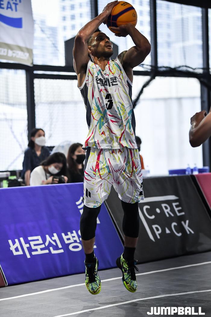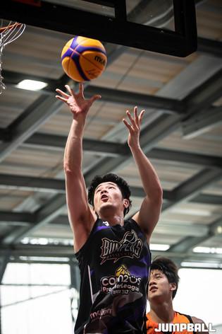 [점프볼=고양/유용우 기자] 15일 스타필드 고양 루프탑에 위치한 스포츠 몬스터 코트에서 열린 '까스명수 THE ORIGINAL 3대3농구대잔치' 조별 예선 경기, 한솔레미콘 전태풍이 2점슛을 던지고 있다.