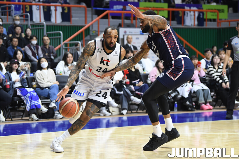 KT는 불안하게 출발했다. 허웅에게 점퍼를 내준 걸 시작으로 연속 10실점했다. 이후 2쿼터 초반까지 10점 차 내외에서 공방을 펼쳤다.