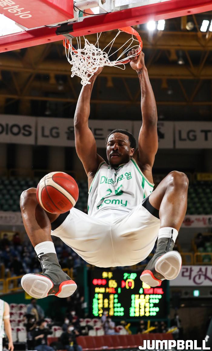 [점프볼=윤민호 기자] 22일 창원실내체육관에서 열린 2020-2021 현대모비스 프로농구 창원 LG와 원주 DB의 경기에서 4쿼터 DB 녹스가 덩크 슛을 하고 있다.