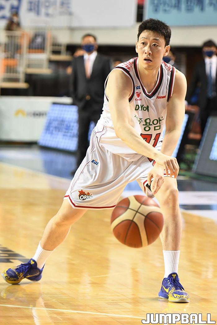 [점프볼=전주/박상혁 기자] 12일 전주실내체육관에서 열린 2020-2021 현대모비스 프로농구 전주 KCC와 고양 오리온의 경기, 오리온 김강선이 골밑으로 패스를 시도하고 있다.
