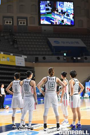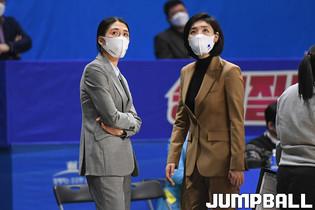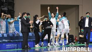 [점프볼=아산/박상혁 기자] 18일 아산이순신체육관에서 열린 'KB국민은행 Liiv M 2020-2021 여자프로농구' 우리은행과 하나원큐의 경기, 하나원큐 신지현과 동료들이 종료 직전 득점에 성공한후 환호하고 있다.