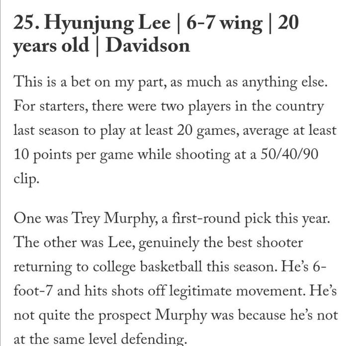 그러나 공신력 있는 NBA 드래프트 전문 기자로부터 좋은 평가를 잇따라 받았다는 건 큰 의미가 있다. 예상 순위는 언제든 요동칠 수 있지만, 앞으로 이현중이 자신의 가치를 더 높인다면 우리는 머지 않아 하승진에 이은 두 번째 한국인 NBA리거를 볼지도 모르는 일이다.