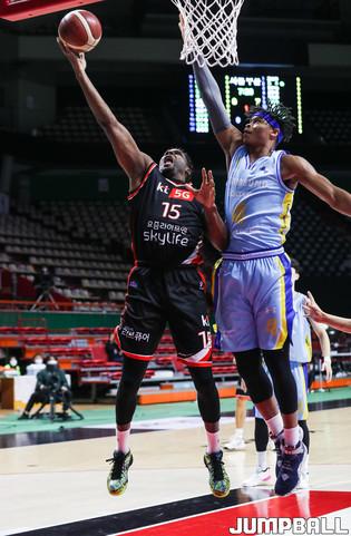 [점프볼=윤민호 기자] 13일 부산 사직실내체육관에서 열린 2020-2021 현대모비스 프로농구 부산 KT와 서울 삼성의 경기에서 삼성 김동욱이 KT 박준영의 수비를 피해 슛을 하고 있다.