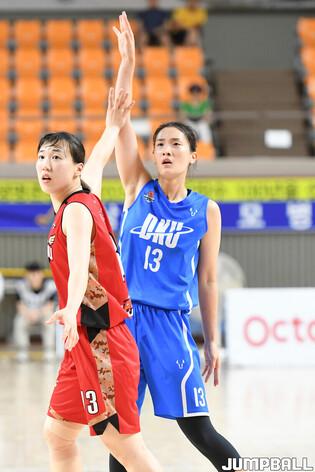 [점프볼=상주/박상혁 기자] 26일 상주체육관 신관에서 열린 제40회 MBC배 전국대학농구 단국대와 광주대의 여대부 결승전 경기, 단국대 양인예가 박지수와 하이파이브를 하고 있다.