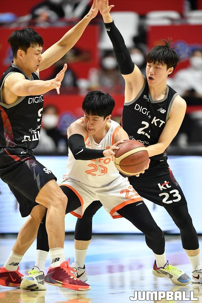 27일 수원 kt 소닉붐 아레나에서 열린 2022-2023 SKT 에이닷 프로농구 수원 kt와 고양 캐롯의 경기, KT 김영환과 최성모가 캐롯 전성현을 수비하고 있다. [점프볼=수원/유용우 기자]