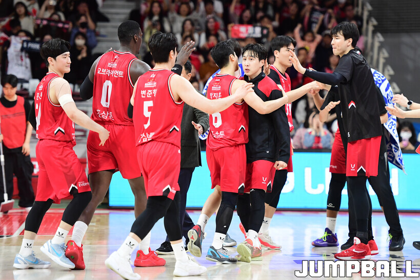 [점프볼=안양/박상혁 기자] 31일 안양체육관에서 열린 2025-2026 LG전자 프로농구 안양 정관장과 창원 LG의 경기, 정관장 선수들이 환호하고 있다.