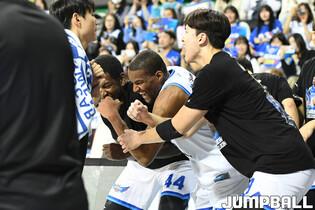 [점프볼=원주/박상혁 기자] 31일 원주종합체육관에서 열린 2023-2024 정관장 프로농구 원주 DB와 대구 한국가스공사의 경기, 한국가스공사 선수들이 환호하고 있다.