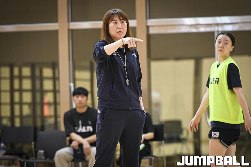 여자농구국가대표팀 정선민 감독이 선수들에게 지시를 하고 있다.