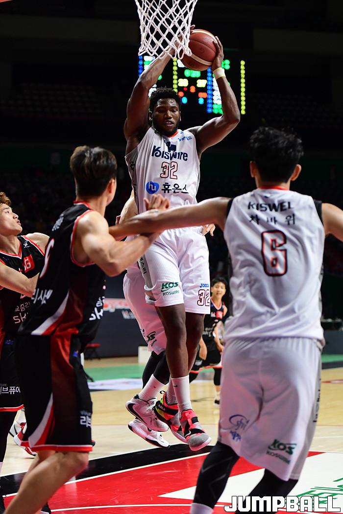 [점프볼=부산/박상혁 기자] 27일 부산사직체육관에서 열린 2020-2021 현대모비스 프로농구 부산 KT와 인천 전자랜드의 경기, 전자랜드 에릭 탐슨이 리바운드를 잡아내고 있다.