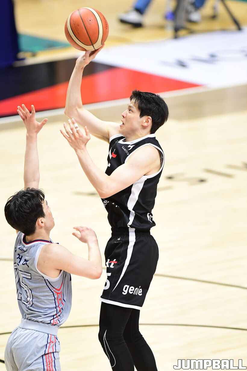 [점프볼=수원/박상혁 기자] 5일 수원 KT 소닉붐 아레나에서 열린 2025-2026 LG전자 프로농구 수원 KT와 울산 현대모비스의 경기, KT 김선형이 플로터 슛을 시도하고 있다.