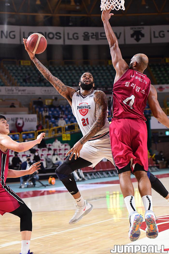 [점프볼=창원/박상혁 기자] 28일 창원실내체육관에서 열린 2020-2021 현대모비스 프로농구 창원 LG와 현대모비스의 경기, 현대모비스 숀 롱이 LG 리온 윌리엄스를 앞에 두고 슛을 시도하고 있다.