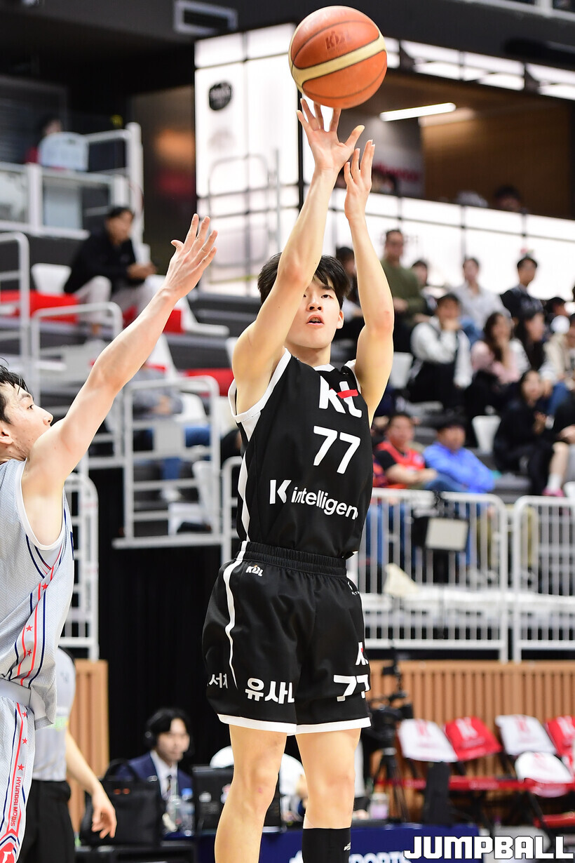 [점프볼=수원/박상혁 기자] 5일 수원 KT 소닉붐 아레나에서 열린 2025-2026 LG전자 프로농구 수원 KT와 울산 현대모비스의 경기, KT 강성욱이 슛을 시도하고 있다.