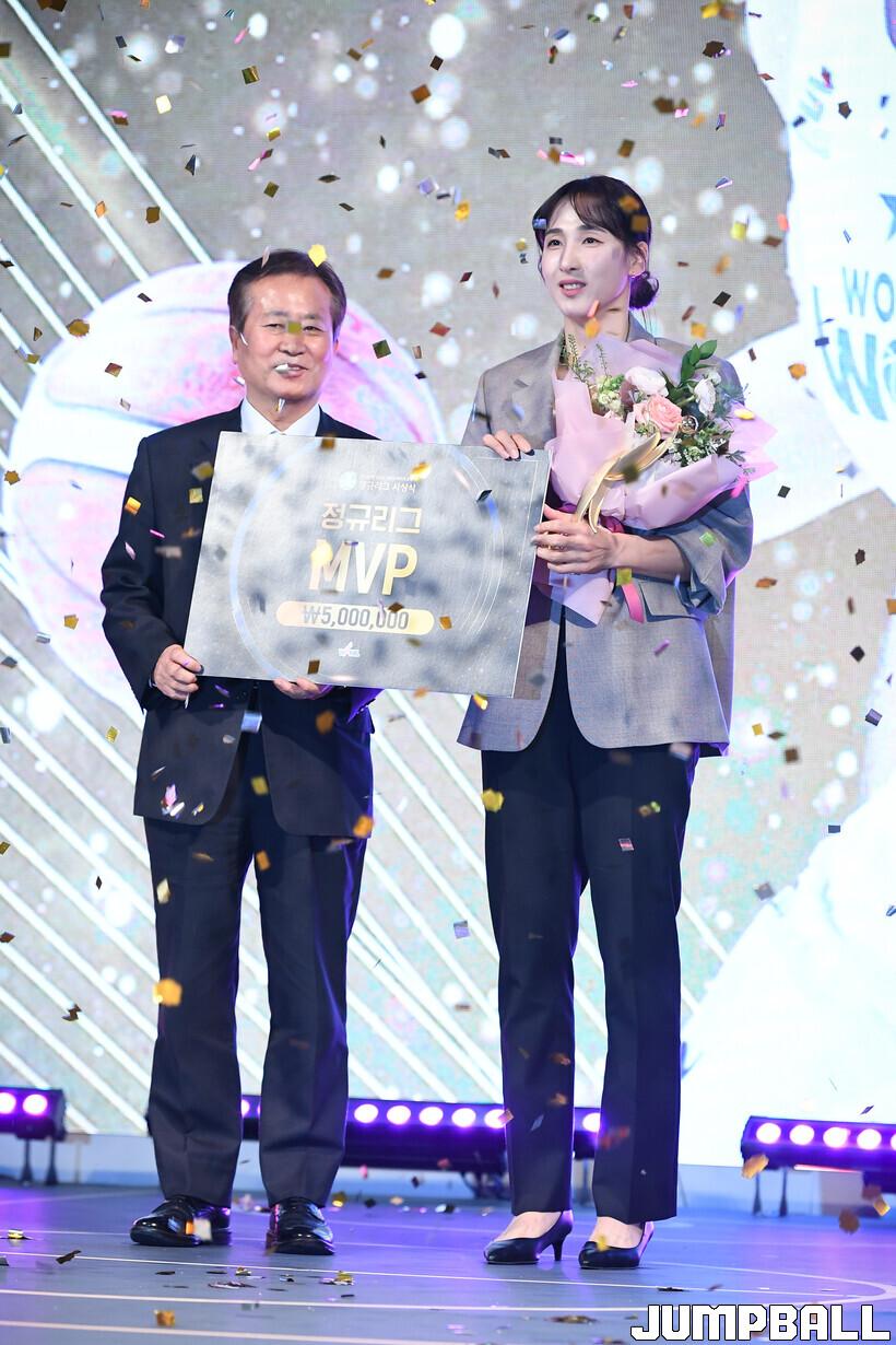 김단비는 24일 용산드래곤시티호텔 그랜드볼룸에서 하나은행 2024~2025 여자프로농구 정규리그 시상식에서 최고의 영예인 정규리그 MVP로 선정됐다. 김단비는 기자단 투표에서 116표 모두 획득, 역대 6호 만장일치 MVP가 됐다.